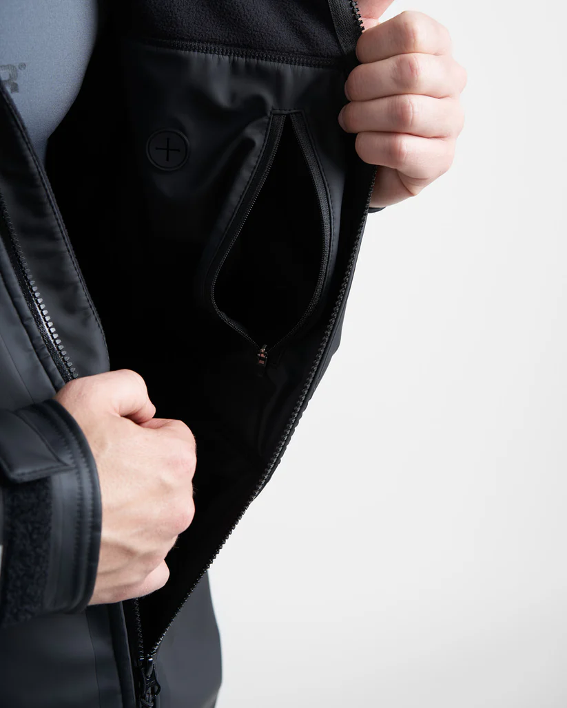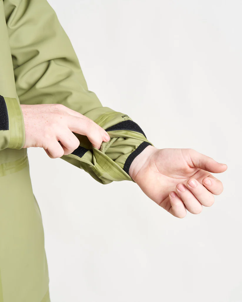 I polsini presentano una costruzione a doppio polsino con un morbido bordo elasticizzato in lycra all'interno e regolatori in Velcro all'esterno. C'è un punto di accesso per le cuffie sulla tasca interna, due tasche esterne profonde foderate in pile con cerniere YKK impermeabili e resistenti per mantenere le cose calde e asciutte. Il collo alto e il cappuccio su misura con visiera tengono fuori vento e pioggia.