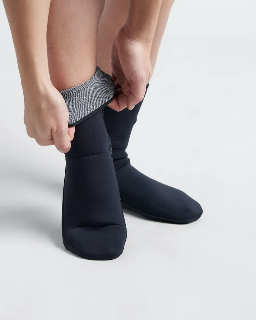 Il calzare è incollato e cucito a punto cieco per prevenire l'ingresso e il ricircolo di acqua fredda, con un design delle cuciture confortevole per massimizzare il benessere durante l'uso.